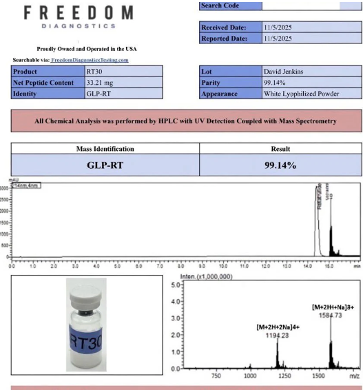 Each batch is submitted to a third-party laboratory for analytical testing. Testing verifies compound identity and purity using HPLC and Mass Spectrometry.